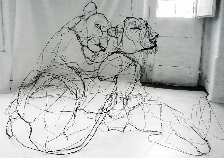 Португальский художник Дэвид Оливейра «рисует» удивительные скульптуры. «Рисует» он их из проволоки, но визуальный эффект создается такой, словно фигуры животных нарисованы карандашом прямо по воздуху. Скульптор по образованию он нашел себя в создании воздушных рельефных картин.