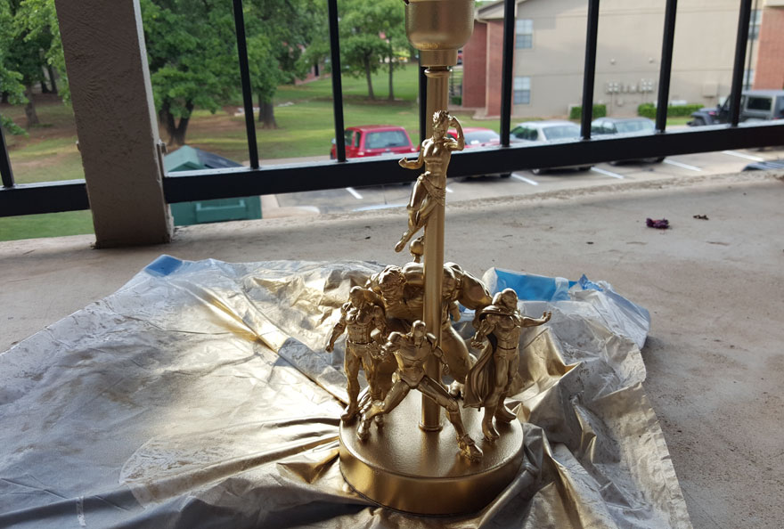 Настало время менять старую лампу, а новую никак не выбрать? Может быть стоит искать этот предмет интерьера не в строительных или мебельных магазинах, а в магазинах игрушек? Берем старую комиссионную лампу за несколько долларов, суперклей, грунтовку, золотистую краску и умелые руки. Вуаля — шедевр.